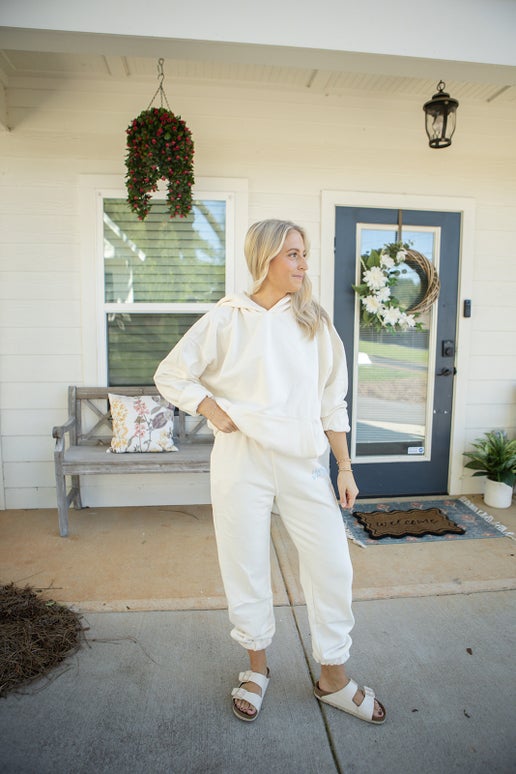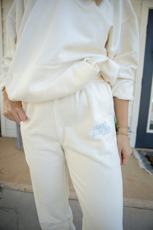 Cozy cream fleece sweatpants with a relaxed fit, elastic waistband, and pockets. Finished with a subtle sky-blue “Happy to be here” graphic on the pocket. Perfect for lounging or casual everyday wear.