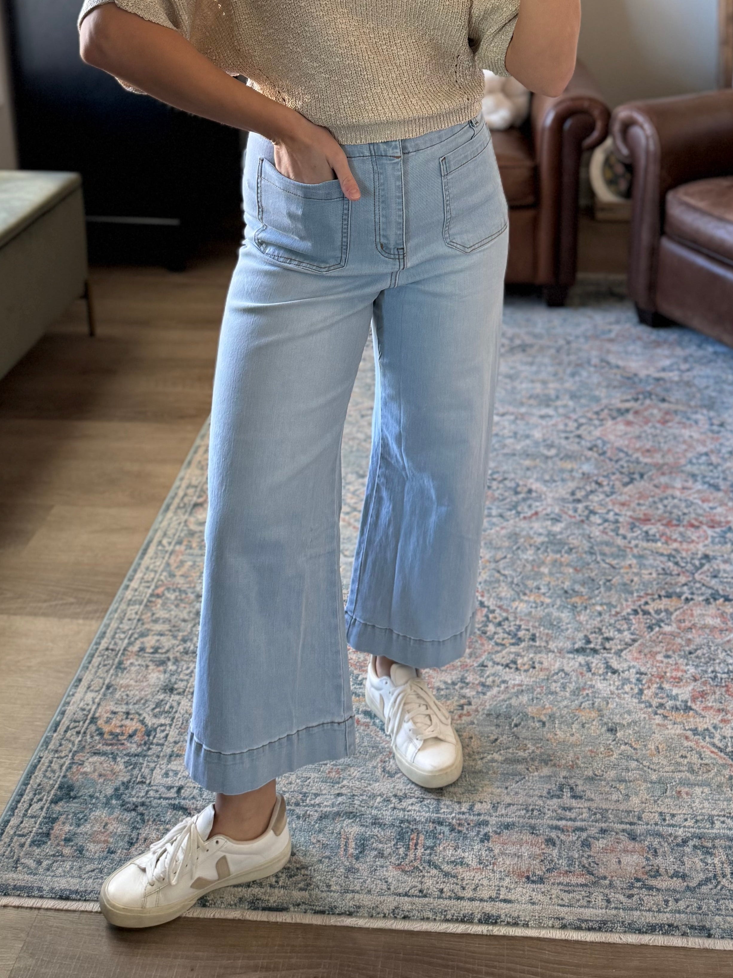 The perfect light wash, wide leg pants! They are slightly cropped with an adorable unique front pocket. With a comfortable stretch, these pants are the perfect denim to transition in to spring!